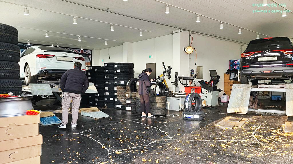 둘러보다 타이어 보관 장소가 보이지 않아 문득 궁금해서 타이어 보관은 어떻게 하는지 물어보니, 윈터타이어만을 보관하는 자체 창고가 따로 있어서 그곳에서 보관을 하고 있으며, 교체 일정이 잡히면 그때 장착점으로 배송을 미리 해놓는다고 한다.
