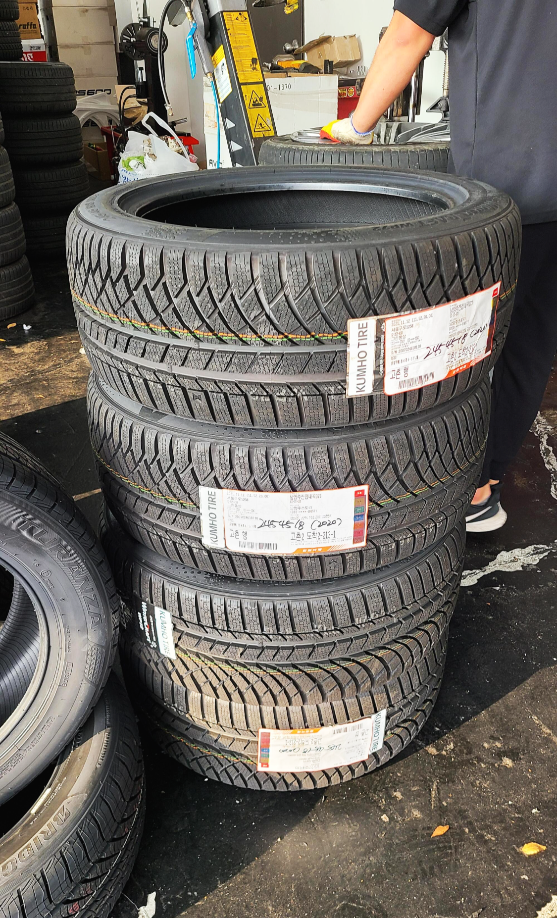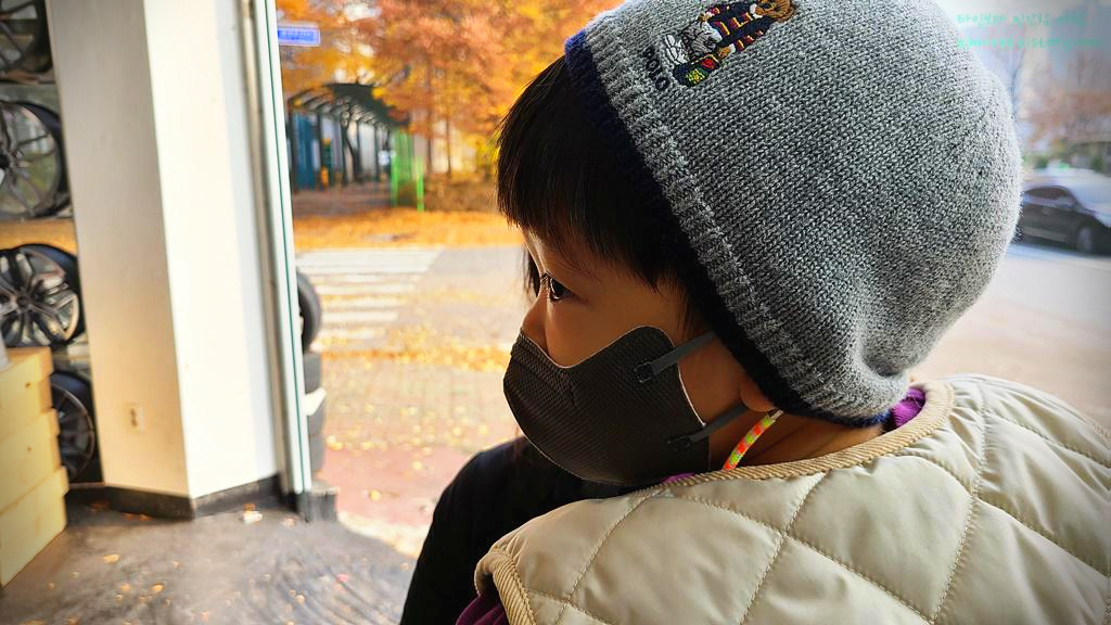 와이프와 아들과 함께 밖에서 단풍 구경을 하다가 내 차례가 되어 들어와 보니 내가 주문한 타이어가 이쁘게 대기 중이었다. 그동안 타이어 선택을 위해 유튜브나 사진으로는 수도 없이 후기를 봤었지만 직접 와서 보고 만져보니 윈터 성능 및 WET/DRY 성능을 위한 최적 비율을 연구했다는 비대칭 패턴은 더욱 멋져 보였고, 무엇보다 정말 지우개를 눌러보는 듯한 부드러운 느낌이 놀라웠다.