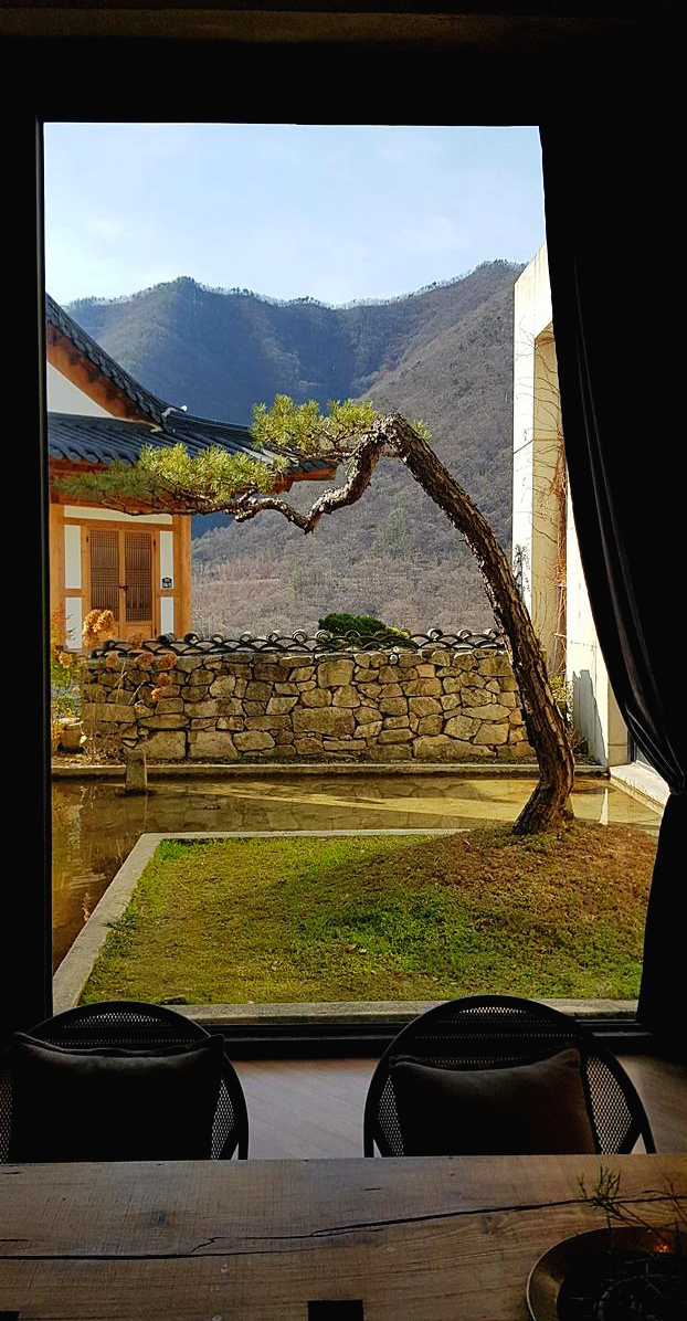 있는 공간 밖으로 멋진 형상의 소나무가