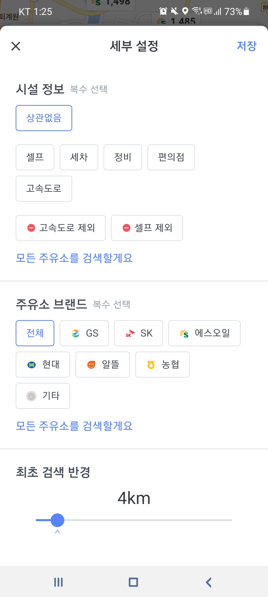 고급유, 주유소 브랜드 등 검색 범위를 정하여