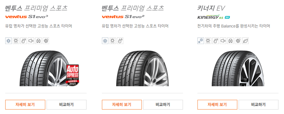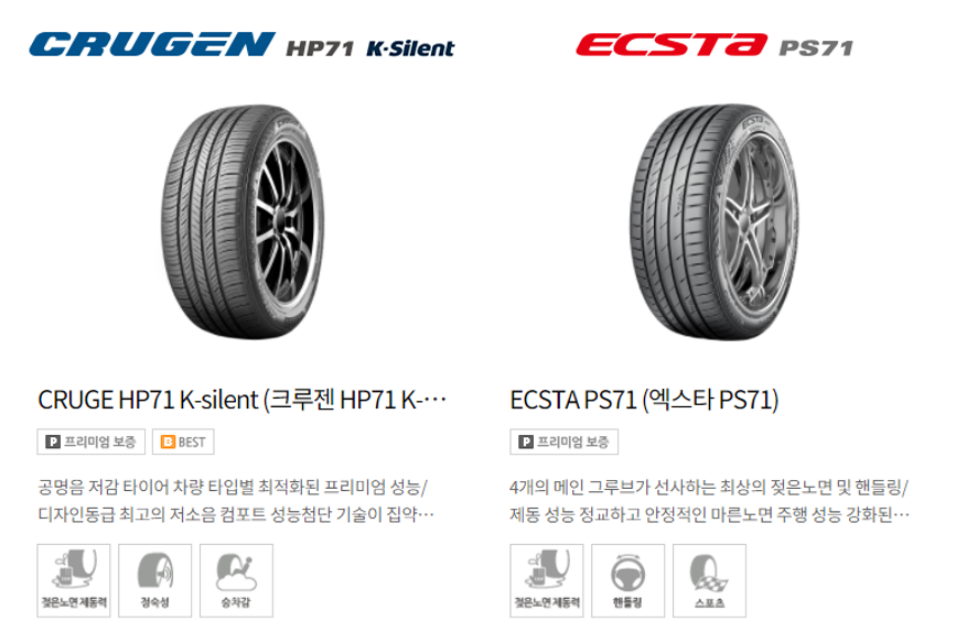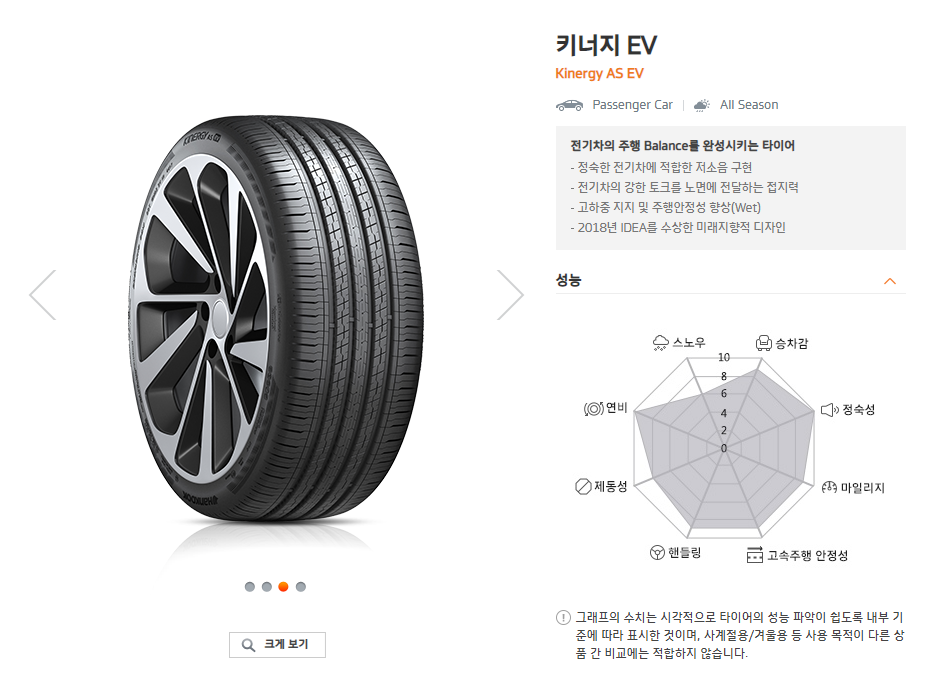 일단 우리나라에서 보통의 운전자들이 흔하게 알고 있는 한국타이어, 금호타이어, 넥센타이어를 중심으로 조사를 해봤는데 홈페이지에서 '전기차 타이어'라고 해서 별도 카테고리를 구성해놓은 곳은 한국타이어 밖에 없는 상황이며, 제조사들도 아주 특정하여 전용 타이어를 만들기 보다는 전기차에도 사용 가능할 정도로 개선된 품질의 공용 타이어를 생산하는 것으로 보인다.