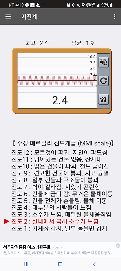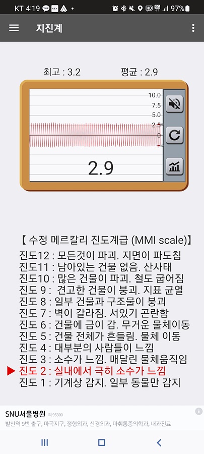 사실 진동이라는 것이 매우 주관적인 영역이고 나도 내 몸을 믿을 수 없어서 사전에 지진계 앱을 받아서 테스트를 해본 결과 정말 놀라울 정도로 직접적인 변화가 확인되었다.