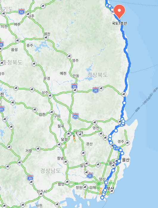 - 특징: 동해에서 남해로 넘어가는 구간으로 다양한 해안 도시를 관통