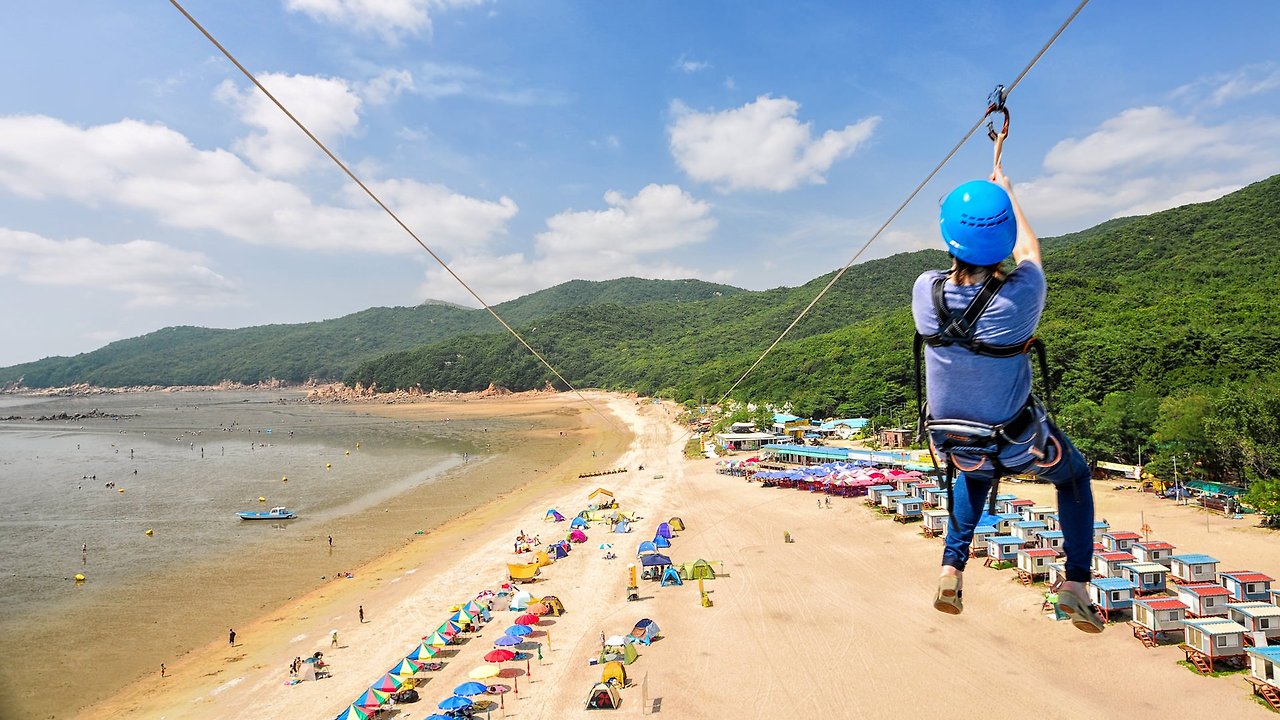 하나개 해수욕장에는 씨스카이월드 짚 라인이 설치되어 있어 짜릿한 경험을 원하는 방문객들에게 인기가 높습니다. 특히 여름철에는 모래사장 위를 가로지르는 짚 라인을 타며 독특한 경험을 할 수 있습니다.