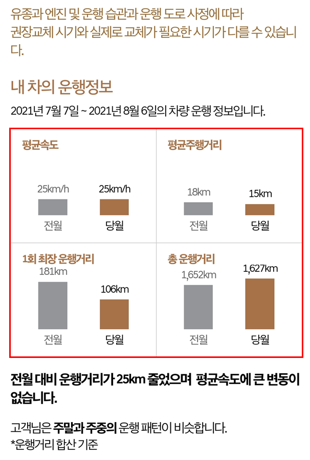 위 운행정보는 내 차량 관리 어플에서 확인할 수 있는 최근 한달 동안의 평균속도 및 평균주행거리이며 수치상으로 봤을 때 가혹조건에 완벽하게 맞아떨어지는 상황이다. 물론 디젤 차량이기도 해서 주말마다 의도적으로 중장거리를 달리기 위해서 이리저리 돌아다니고는 있지만 결국 우리나라의 도로 상황상 고속도로로 진입하기 전까지도 기본적으로 교통체증이 많은 환경이므로 웬만하면 가혹조건에 놓고 판단을 하시는 것이 맞다고 생각한다.