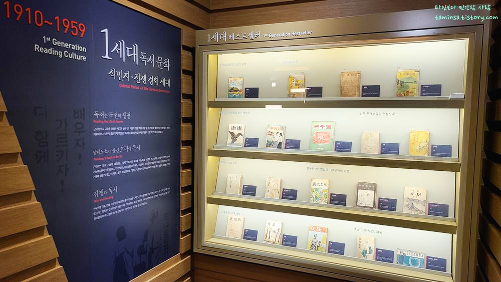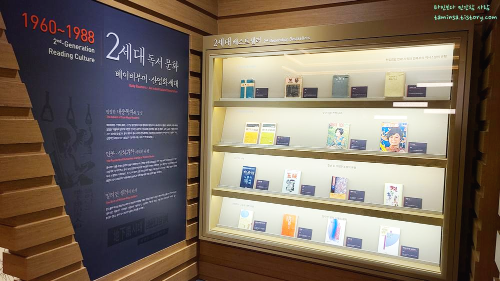 조선의 독서 문화에 대한 전시를 지나면 1910년을 기준으로 한 세대별 독서 문화와 각 세대별 베스트 셀러들을 볼 수 있으며, 개인적으로 나는 이 전시가 가장 재밌었다. 1983년생인 나에게 특히 1세대와 2세대의 독서 문화는 접해본적이 없기에 더 새롭게 다가왔으며, 이제는 어느덧 전자책을 읽는 시대가 된 것을 보면 세상의 변화는 정말 빠르다는 생각이 든다.