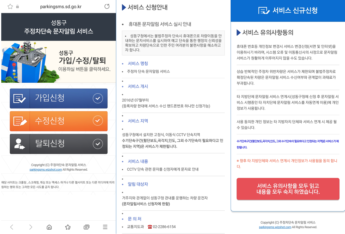 먼저 서비스를 신청하기 전 내가 주차하고자 하는 지역이 서비스 지역에 해당하는지를 확인하여야 한다. 이는 주정차 단속 알림 시스템(http://parkingsms.wizshot.com/www/contents/join_online.php)에서 확인 가능하며 서울 18 지역, 경기도 24 지역, 강원도 8 지역, 부산광역시 9 지역 등 우리가 복잡하다고 알만한 웬만한 곳들은 다 서비스 제공이 가능하다.