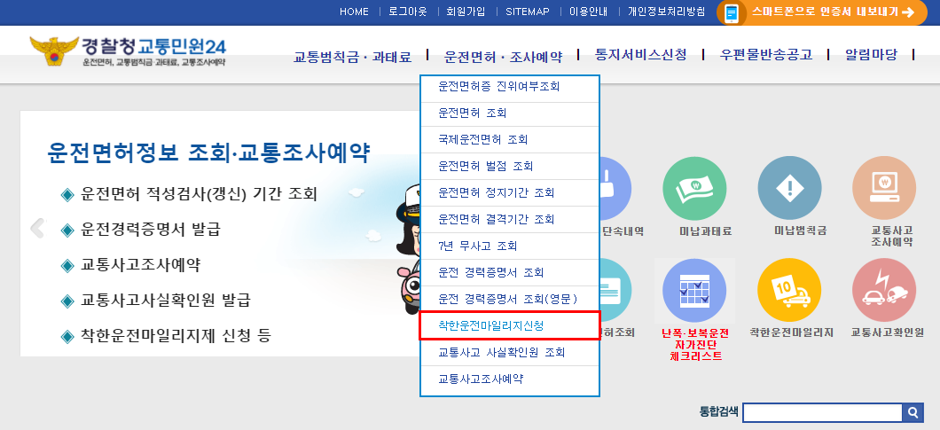 위의 범칙금 조회 서비스와 연결되는 것으로 혹시라도 속도위반 등으로 범칙금이 있을 경우 도움을 받을 수 있는 서비스로 1년간 무위반/무사고 준수 서약 내용을 지키면 10점씩 마일리지를 부과하여 면허 정지 처분 시 누적된 마일리지만큼 벌점을 감경해주는 제도이다. 특히 일 때문에 운전을 꼭 하셔야 하는 분들이 활용하면 좋을 제도라고 생각된다.