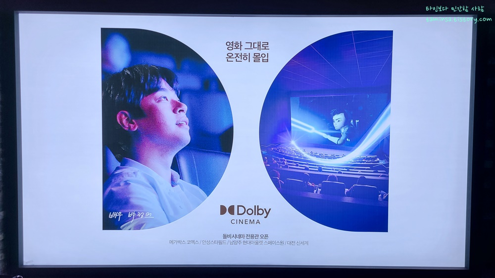 우리나라에는 현재 4개의 메가박스 지점에만 돌비 시네마관이 있어서 아이맥스에 비해 아직까진 상대적으로 희귀한 관이므로 현대프리미엄아울렛 스페이스원점에 놀러 오시게 된다면 오시는 김에 한번 돌비 시네마까지 꼭 경험해보시는 것을 추천드린다.