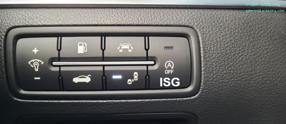 이 기능은 없는 차종들도 있을 것이라 고민을 했으나, 요즘엔 있는 차종들이 많으므로 소개하고자 한다. ISG란 Idle Stop & Go의 약자로 교통 신호 대기 등을 위해 차량이 잠깐 정차되어 있을 때 자동으로 엔진을 꺼지게 하여 배출 가스 저감 및 연비 향상을 목적으로 하는 기능이다.